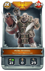 • The Astra Militarum – we have cards from several Imperial Guard regiments, with a tendiency to focus on firepower, but with some outliers like the Death Korp Death Rider, or bodyguard Nork Deddog. Most Astra Militarum cards tend to be quite cheap, making them useful for building ‘horde’ decks or filling in a last few points you have to spend.