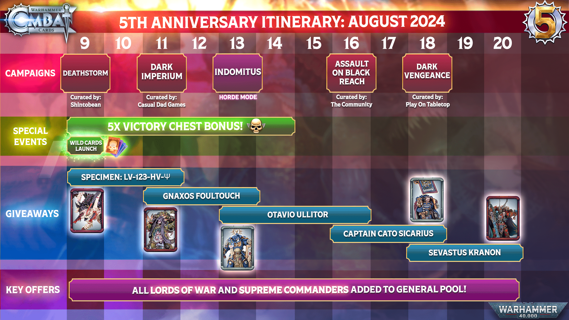 We’re thrilled to announce the 5th anniversary of Warhammer Combat Cards! To commemorate this monumental milestone, we’ve crafted a spectacular celebration around the theme of “Five 5s” that will take us down memory lane with five pivotal moments in 40,000 history, complete with exclusive rewards and events for our dedicated community.